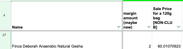 An example is the Finca Deborah Parabolic Gesha. Using the above formula (with a 2x multiple), the 120g offering is $60. That’s... a bit too much.