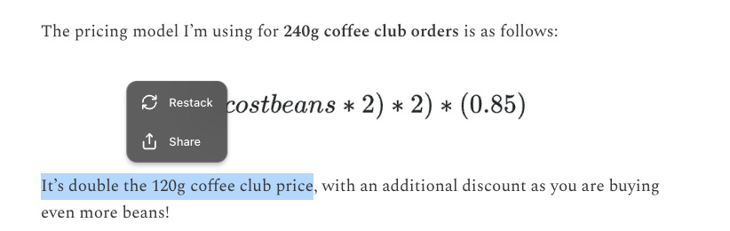 We didn’t do this purposefully; it initially made sense that the price of a 240g would be twice that of a 120g bag when costs were just the coffee greens (plus the numbers usually came out reasonable).